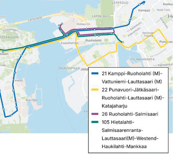 Linja 22 koukkaa pian Jätkäsaaren kautta Punavuoreen ja Laruun