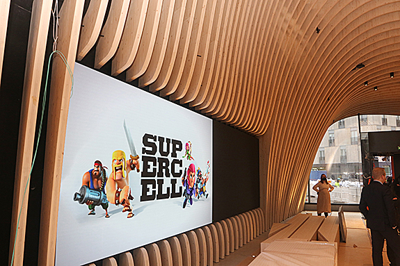 Peliyhtiö Supercellin pääkonttorin aula Wood City -korttelissa. Kuva on vuodelta 2020.