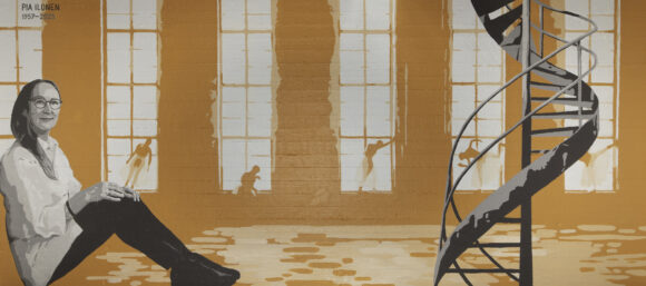 Kaapelin edesmennyt, pitkäaikainen puitesopimusarkkitehti Pia Ilonen istuu Merikaapelihallissa. Häntä pidettiin todella iloisena ihmisenä. Taustan tanssijat ovat saaneet inspiraationsa Jorma Uotisen Ballet Pathétique -nykytanssiteoksesta, jonka Stefan Bremer ikuisti aikanaan promovalokuvaan.