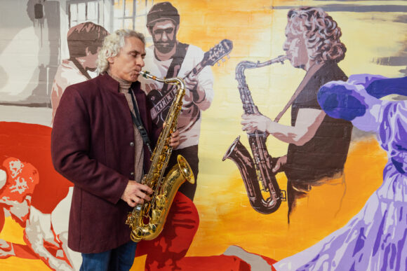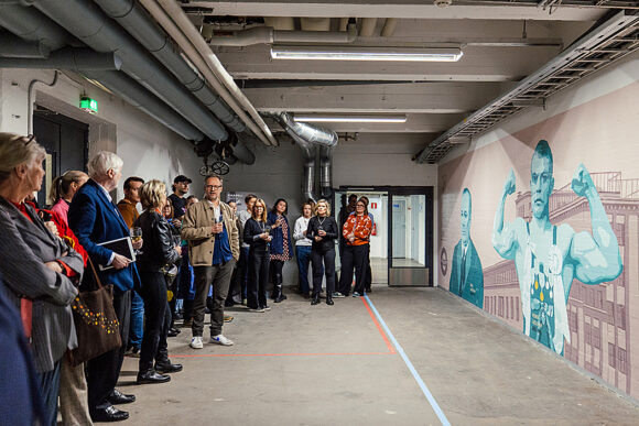 ”On ollut ihanaa maalata, kun talossa toimivat ihmiset ovat ohi kulkiessaan kertoneet tarinoita. Saksofonisti Stephen Stalter tunnisti itsensä seinältä”, Ruusa nauratti yleisöä muraalien avajaisissa 25. marraskuuta.