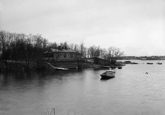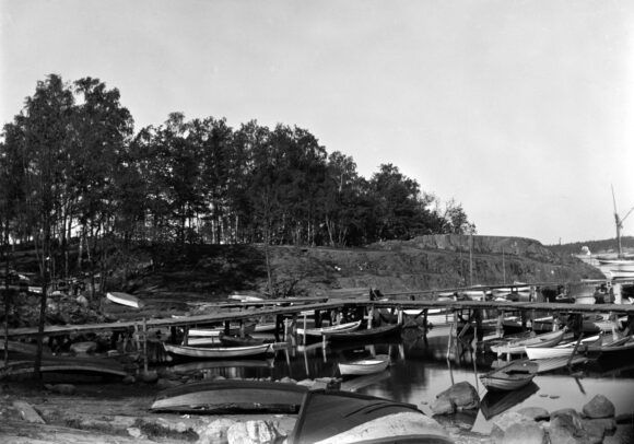Jätkäsaaressa oli 1900-luvun alussa varakkaiden helsinkiläisten kesähuviloita. Puutalot saivat väistyä Länsisataman alta, jonka rakentaminen alkoi 1913. Kuva samalta vuodelta. (kuva:  Eric Sundström, Helsingin kaupunginmuseo)