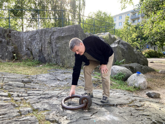 “Aika järeä”, sanoo Jätkäsaaren kaavoituksesta vastannut arkkitehti Matti Kaijansinkko nostaessaan vanhaa laivankiinnitysrengasta. Ruoholahden nuorisotalon vieressä on näkyvissä Jätkäsaaren viimeiset alkuperäiset rantakalliot. (kuva: Pipsa Sinkko-Westerholm)